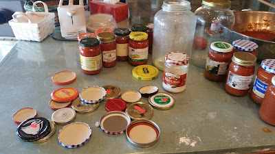 | Tomatoes in the bowl in the back, vegetable peelings in the front bowl, sauce in jars, plus.... |